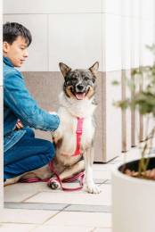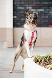 При этом на прогулке Руфа очень ориентируется на своего человека. Стоит только остановиться или присесть на лавочку, она тут же подбегает с проверкой и с удовольствием приляжет в ноги, чтобы тоже отдохнуть, а также с удовольствием подставит свое пузо для почесушек.